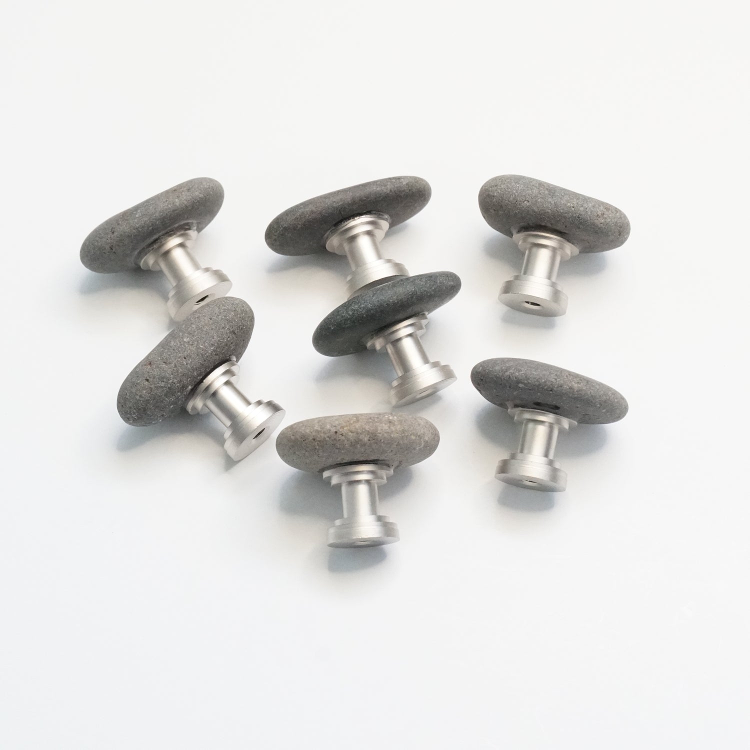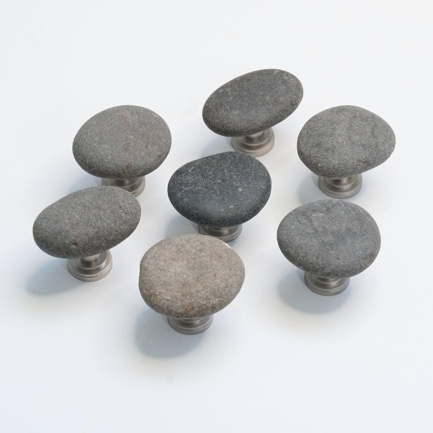 Seven medium mixed gray pebbles set on Satin Nickel stems. These are the exact stones you'll receive, and they are ready to ship.