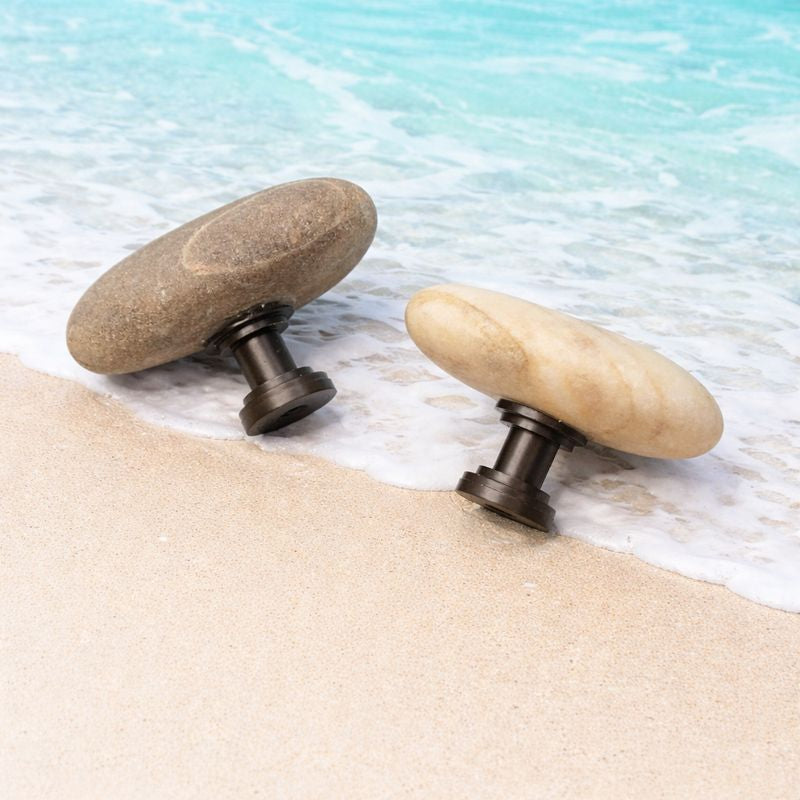 A "Perfect Pair" of natural beach stones set as cabinet knobs. Stones will be the exact ones pictured and they will be ready to ship out! Average size is 2 inches long so these will be larger stones to give you a BIG bold look.