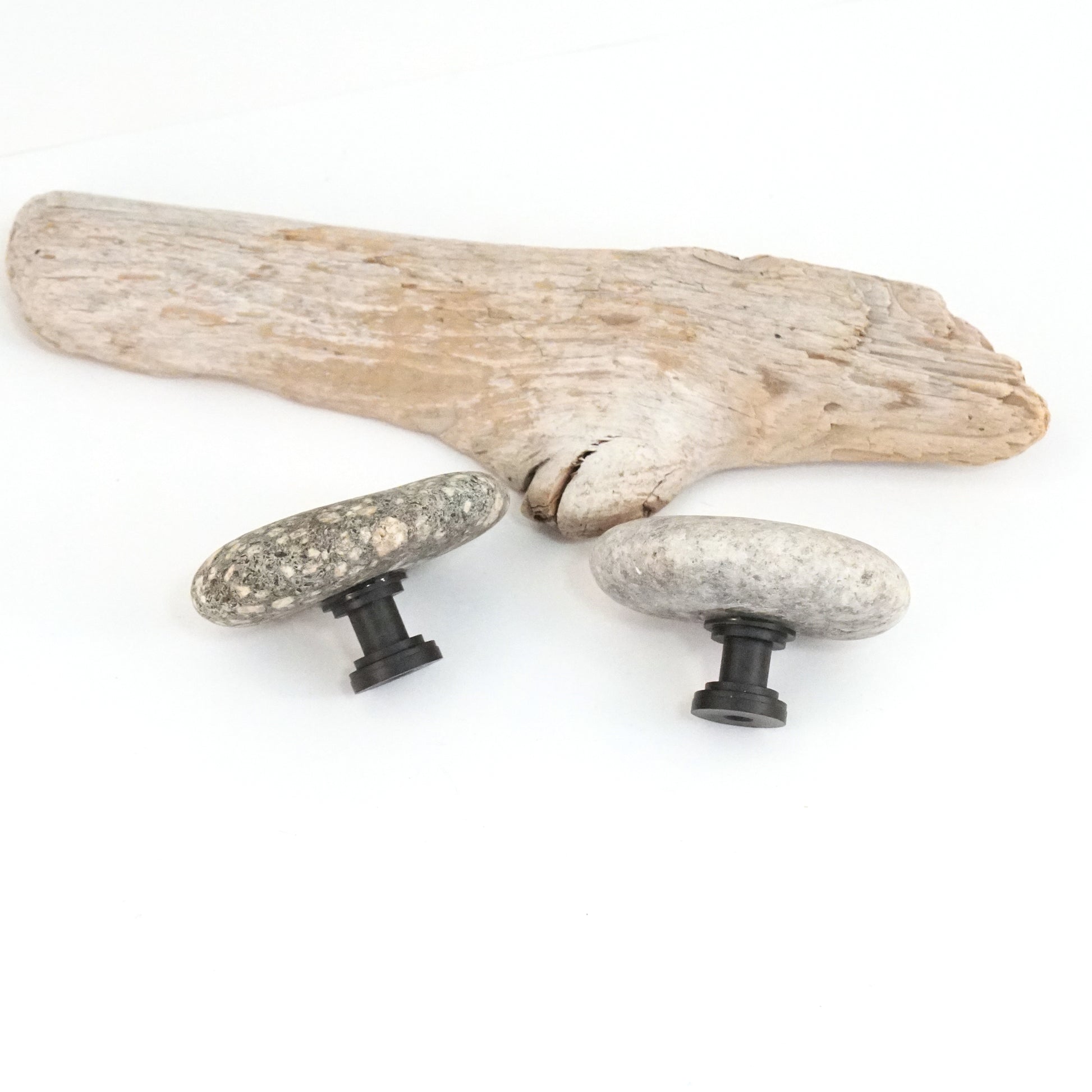 A "Perfect Pair" of natural beach stones set as cabinet knobs. Stones will be the exact ones pictured and they will be ready to ship out! Average size is 2 inches long so these will be larger stones to give you a bold look.