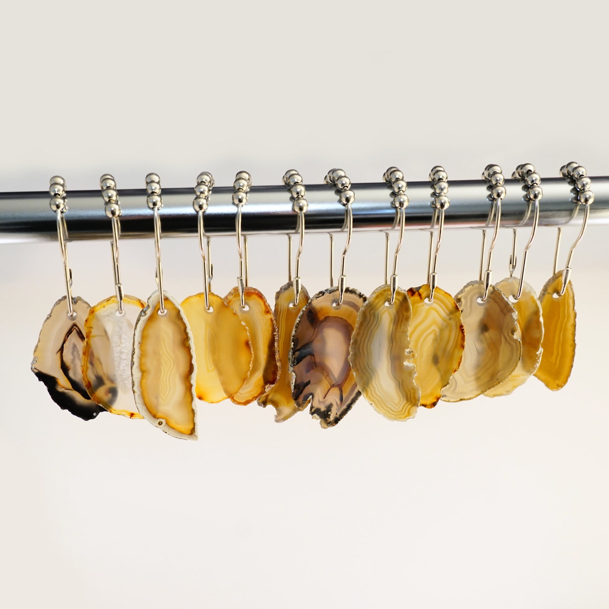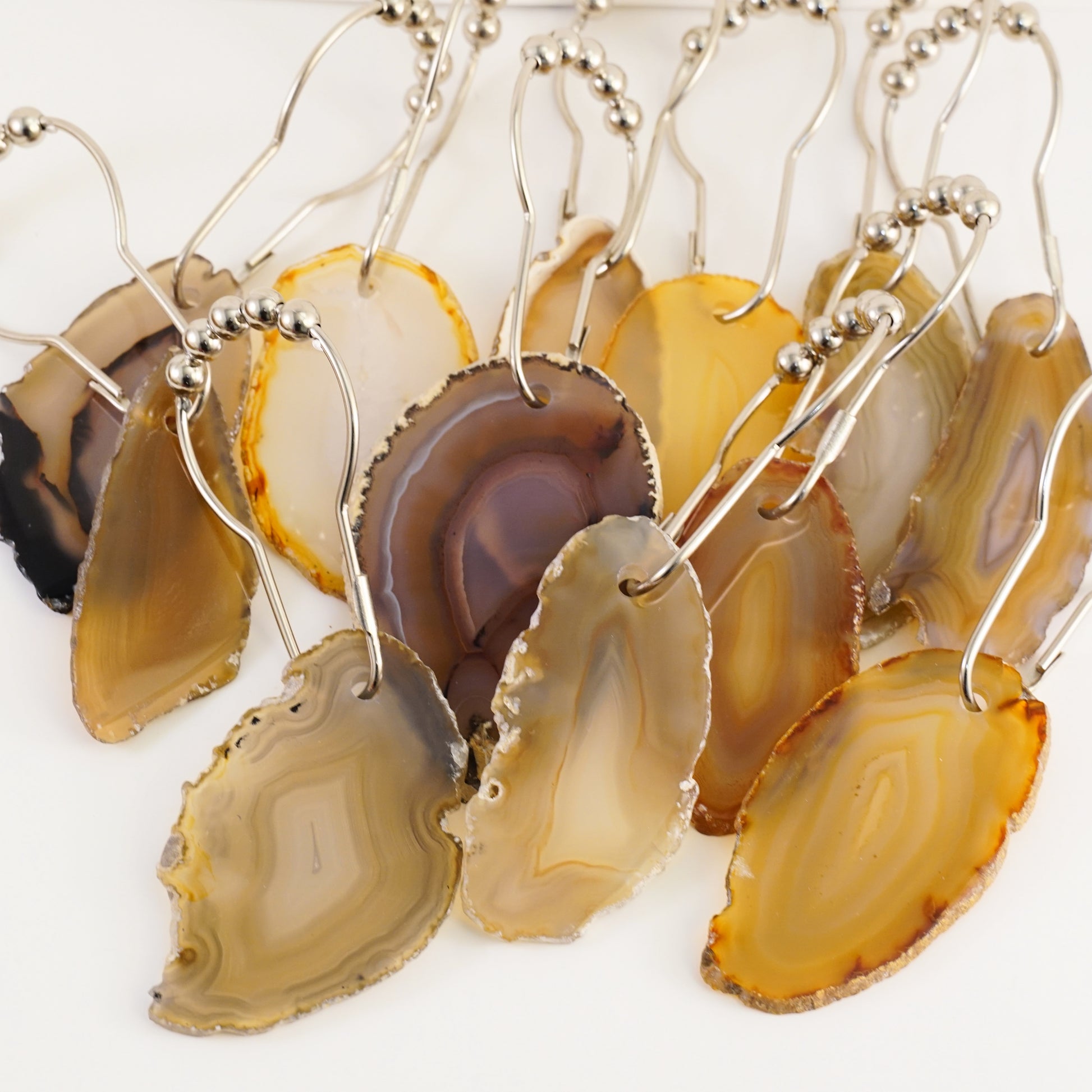 Twelve loop-style silver shower hooks set with a mix of perfectly stunning hand drilled Brazilian Agate slices. An amazingly unique upgrade for your decor!