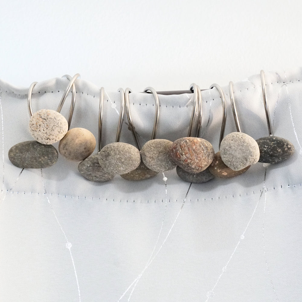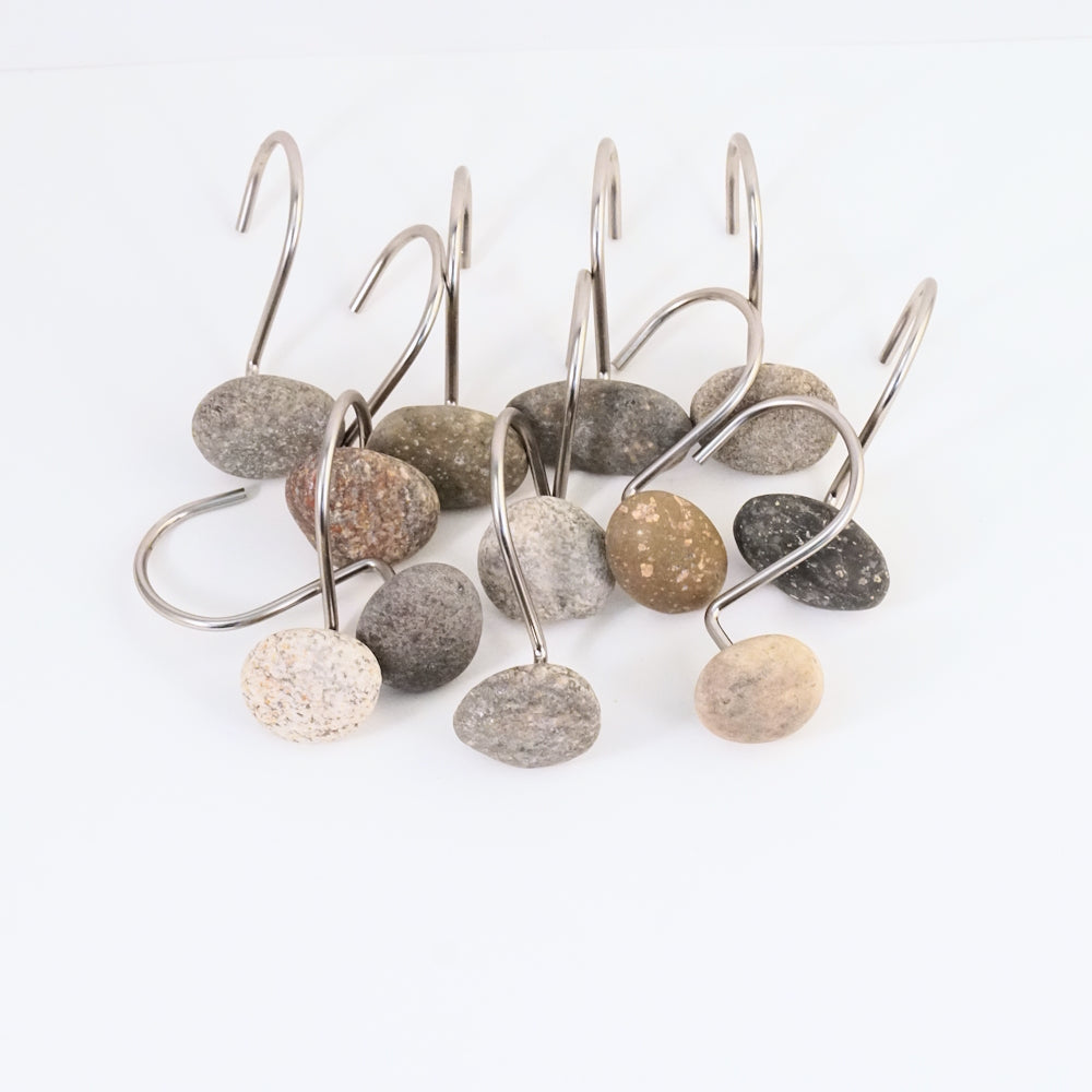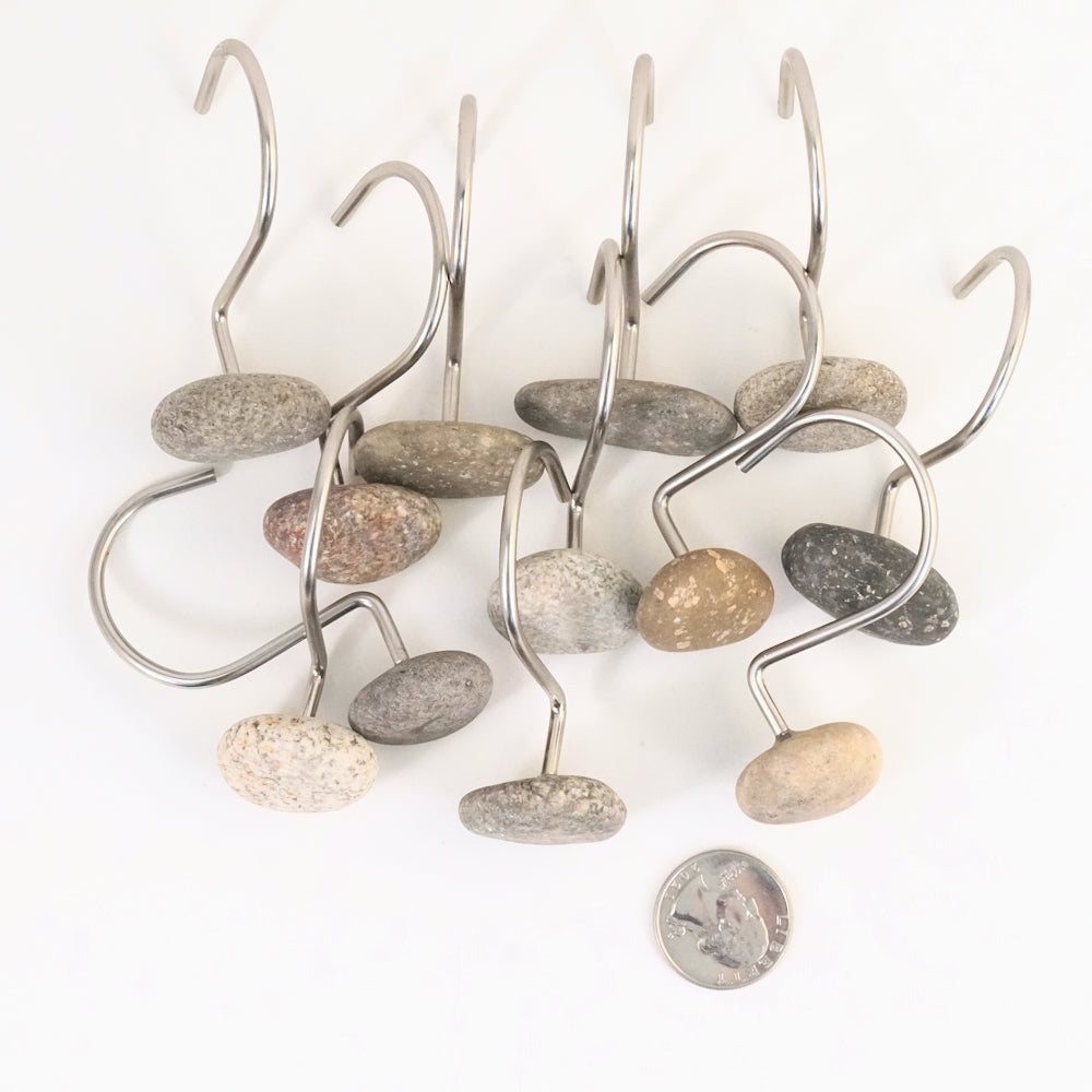 Twelve delicate and thinner Satin Nickel shower hooks set with a mix of fun smaller mixed color natural beach rocks. An amazingly unique upgrade for your bathroom decor!