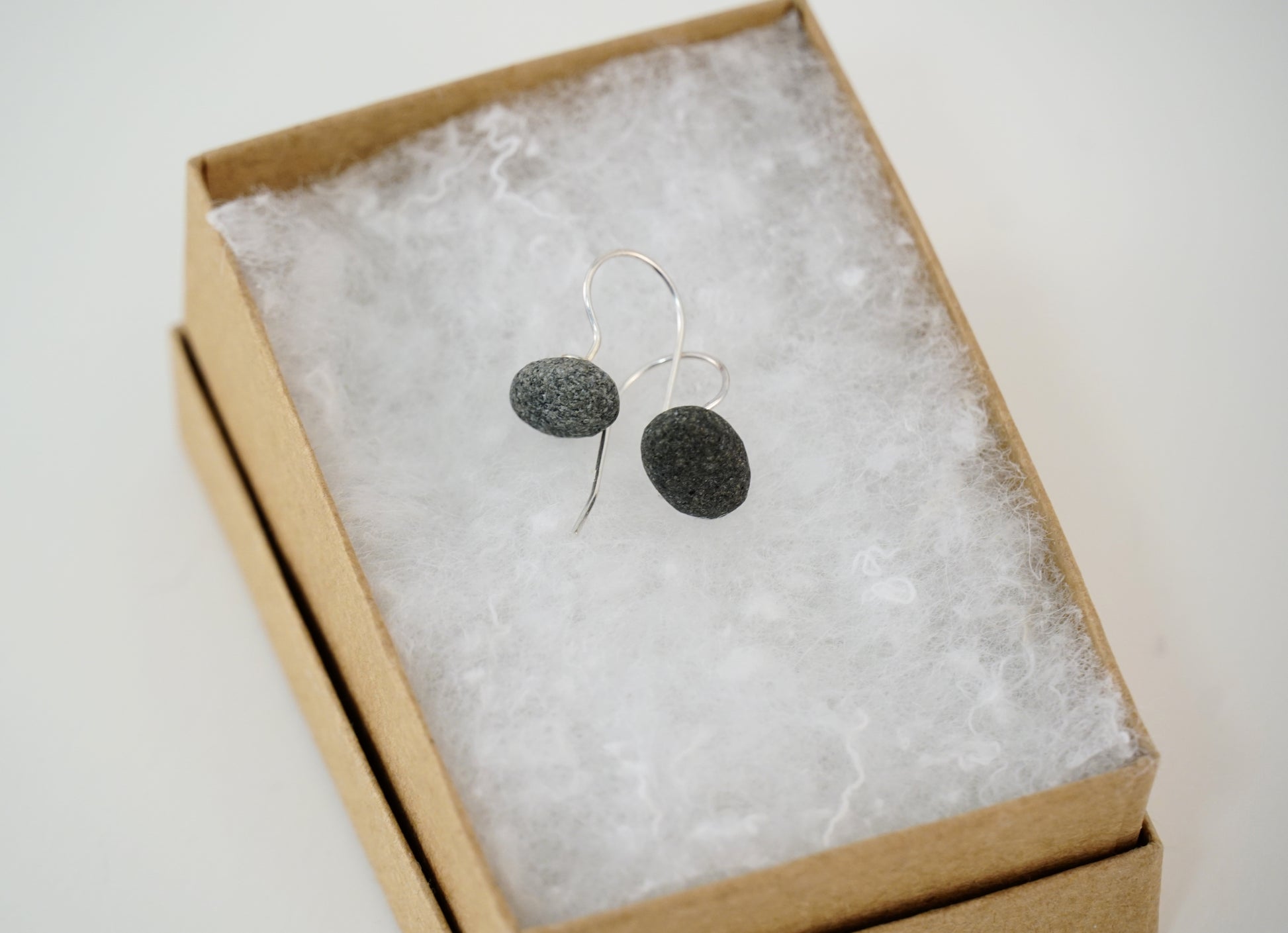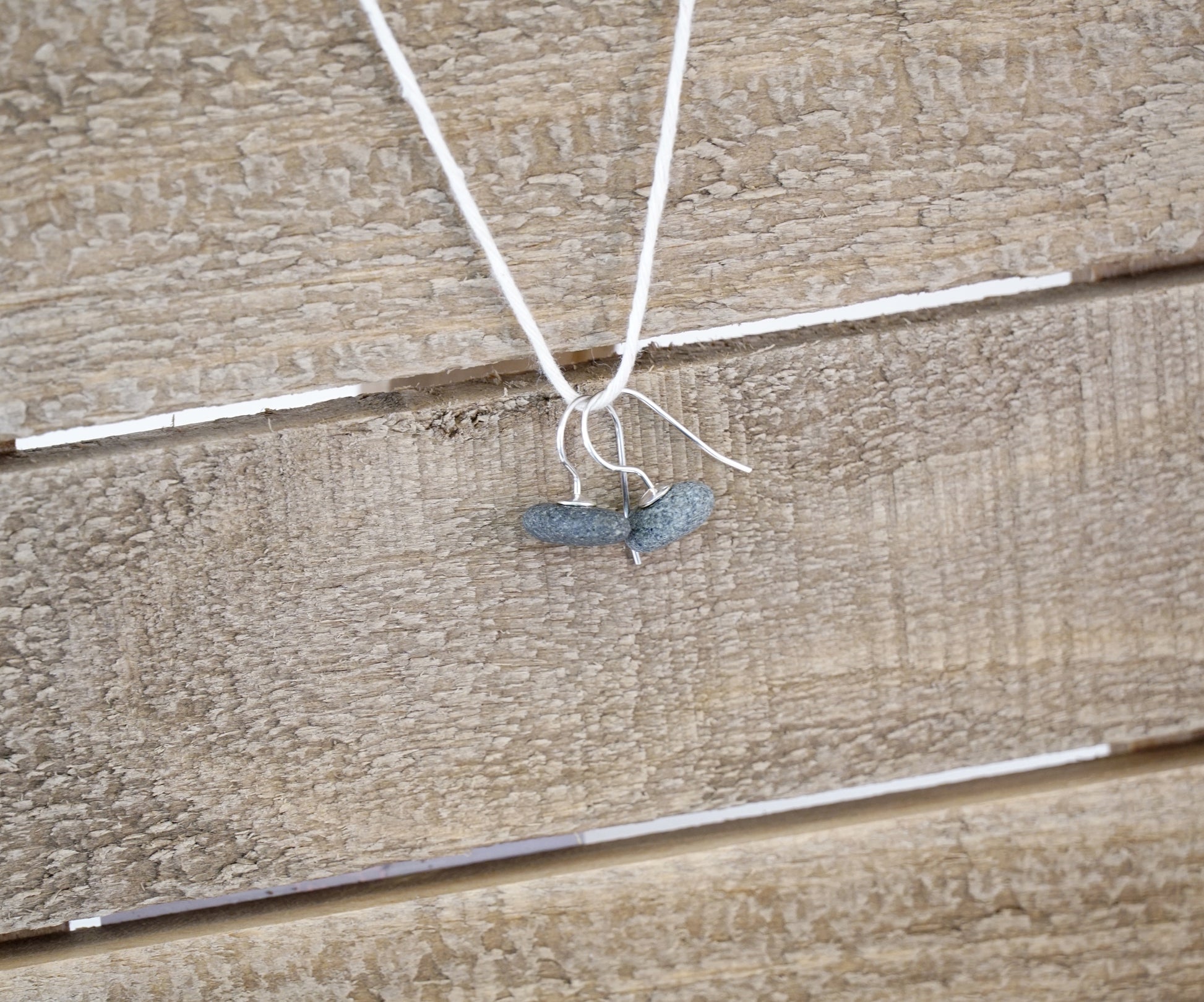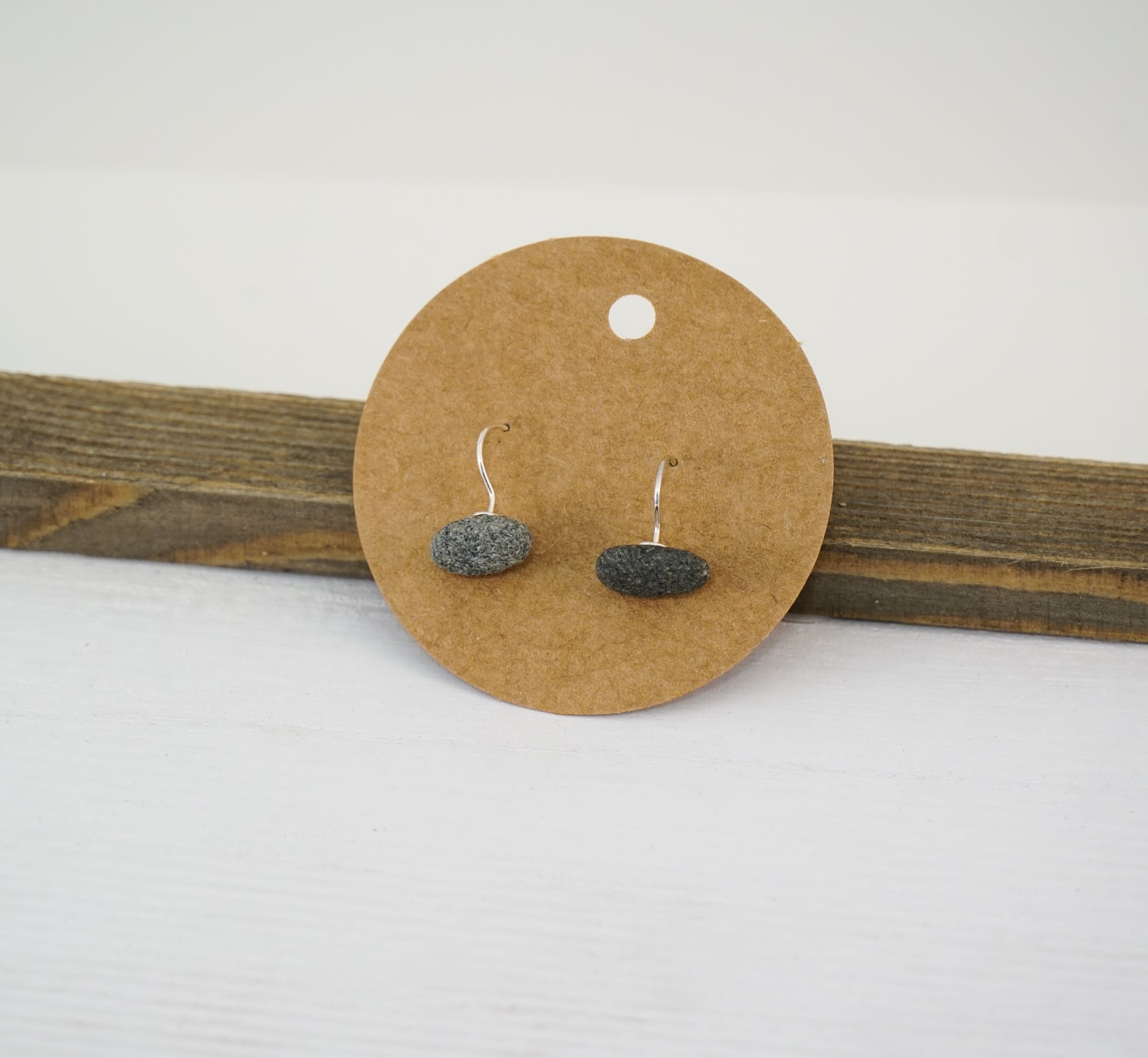Take the beach with you wherever you go! Two tiny naturally tumbled and shaped simple gray beach pebbles set on .925 silver hook ear wires. The little pebbles are just under 1/2 inch wide and have been drilled and set with the stamped .925 hooks.