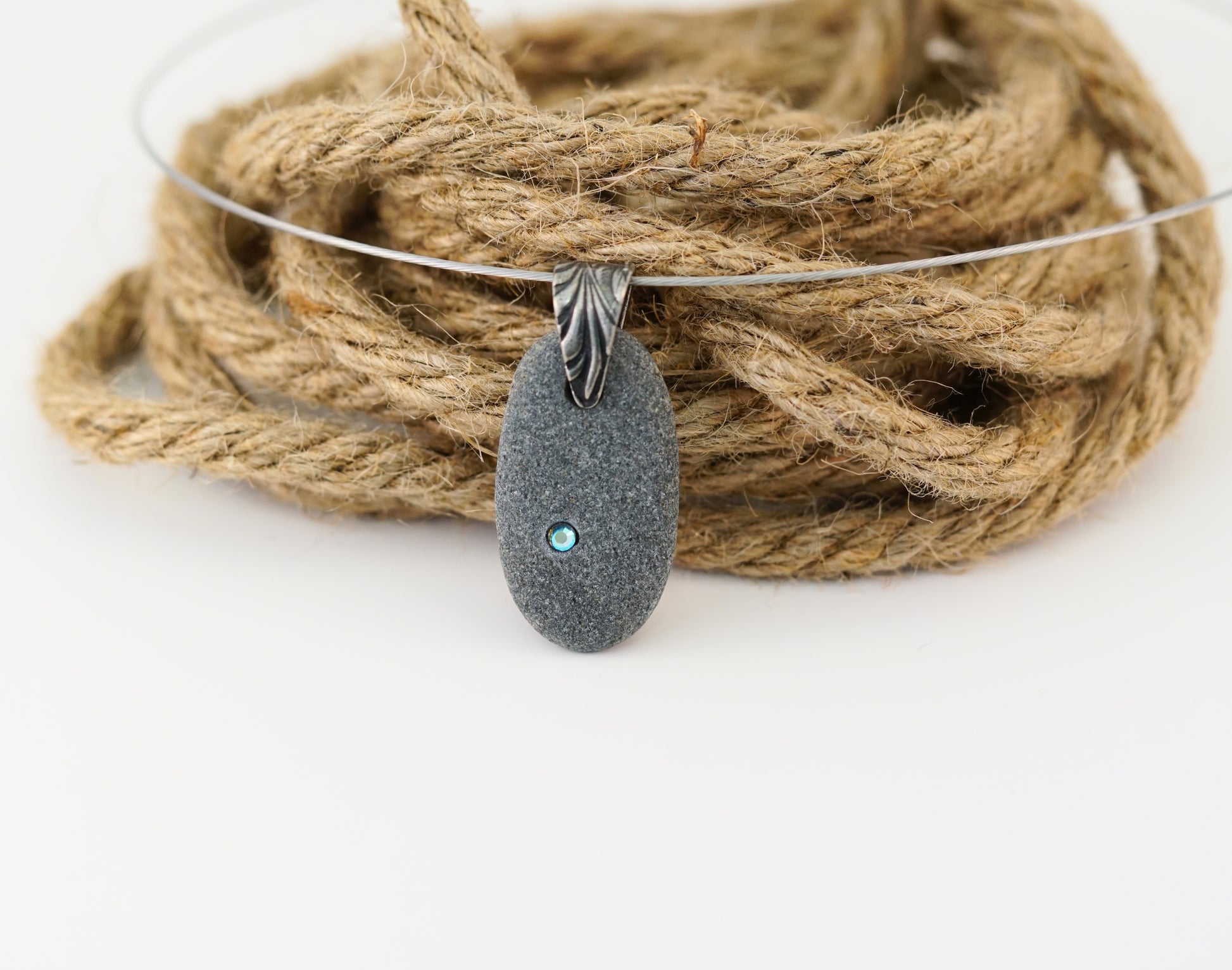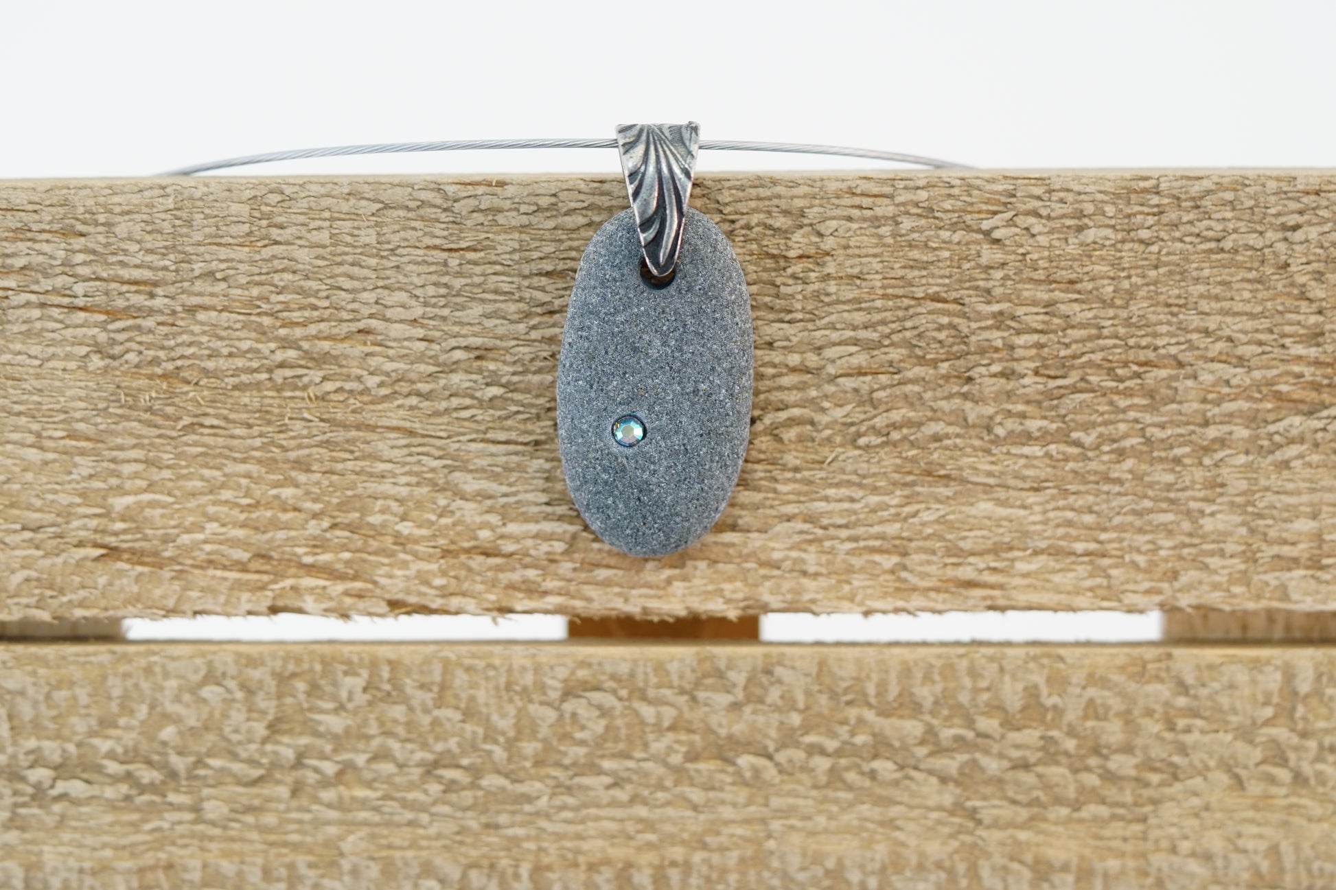 Beach Stone Necklace - Gray Rock Pebble with Swarovski Crystal