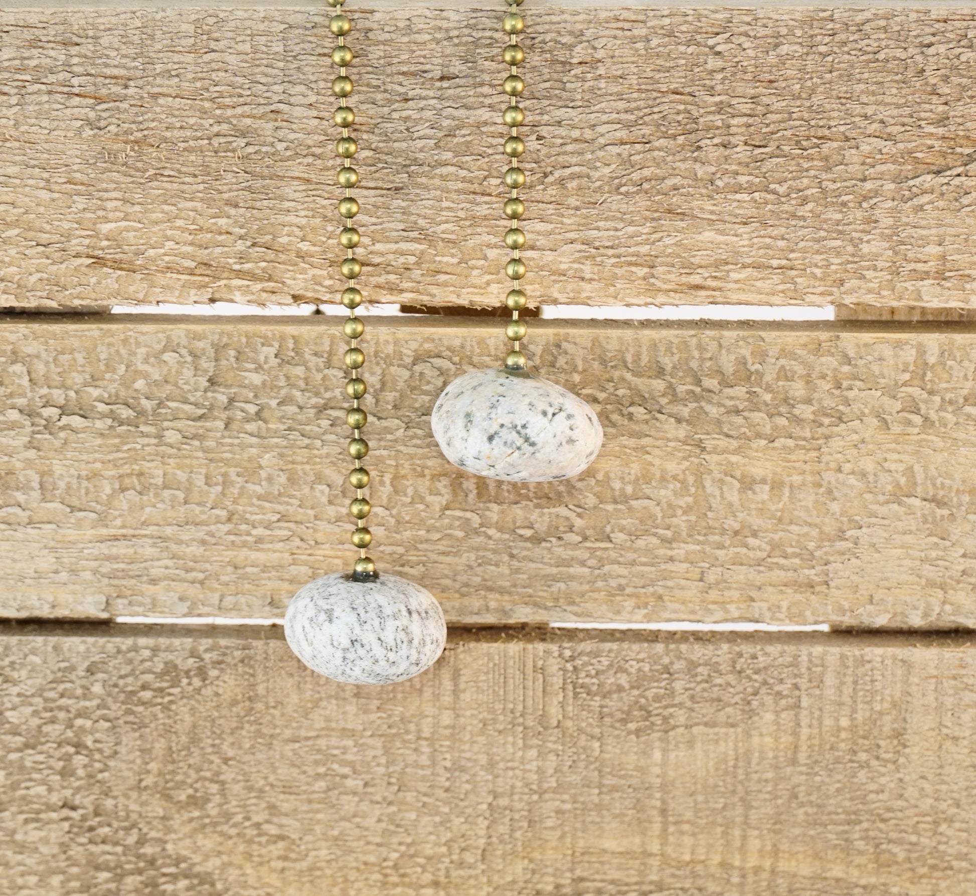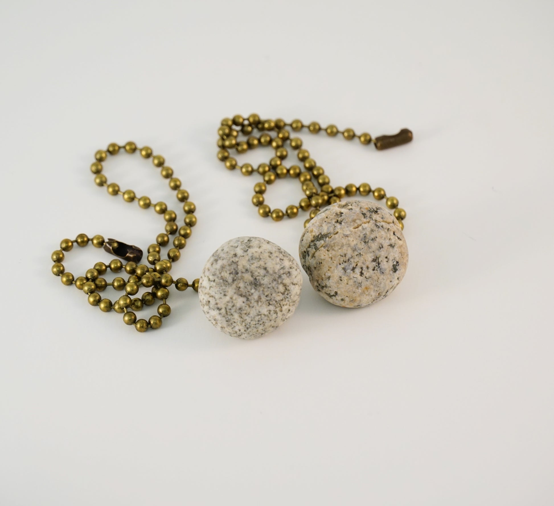 A pair of small round granite beach pebbles drilled and set with standard antique brass light and fan pull ball chains. The chains are 12" long and can be easily shortened.