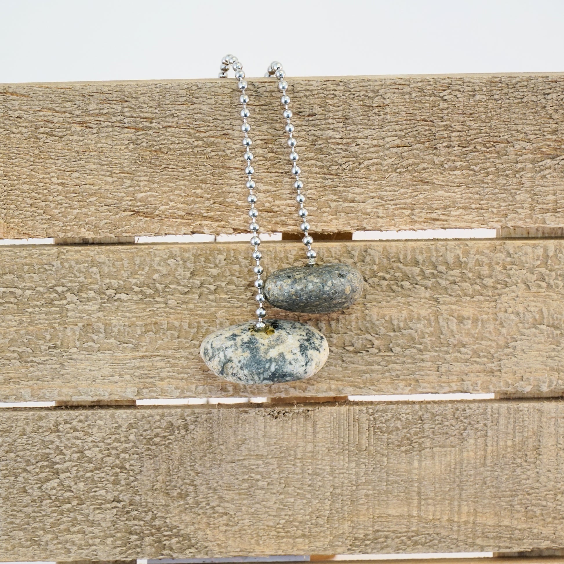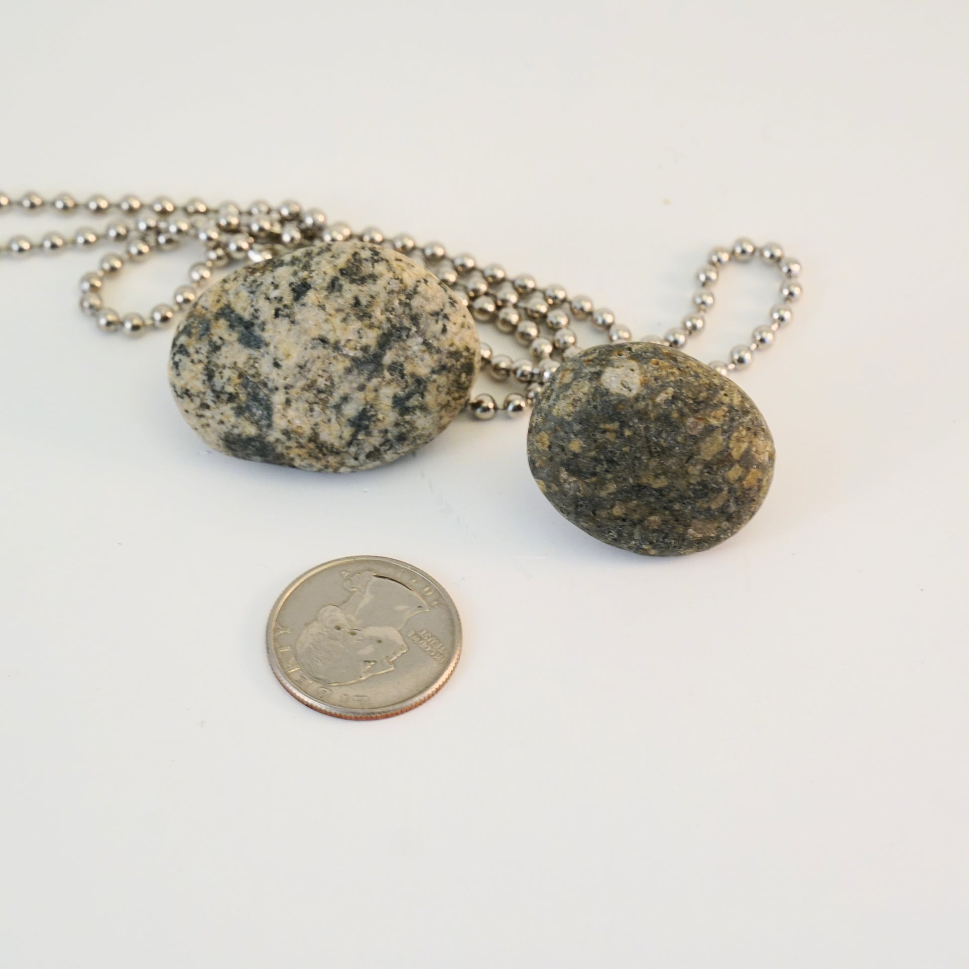 A pair of mixed granite pebbles, drilled and set with standard chrome/silver light and fan pull ball chains. The chains are 12" long and can be easily shortened.