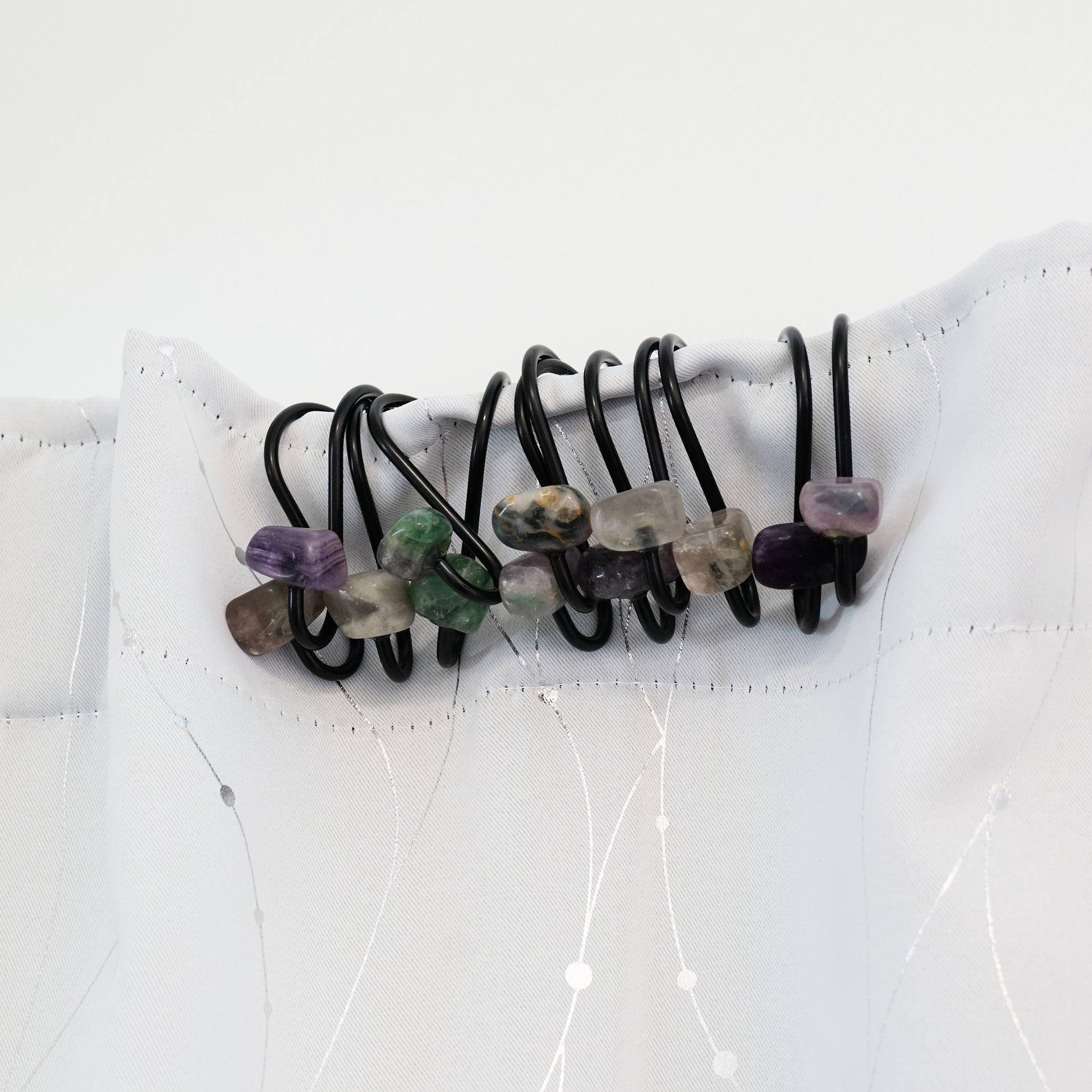 A dozen black shower hooks set with small pieces of tumbled Rainbow Fluorite gemstone. The shower hooks pictured are the exact ones you will receive.