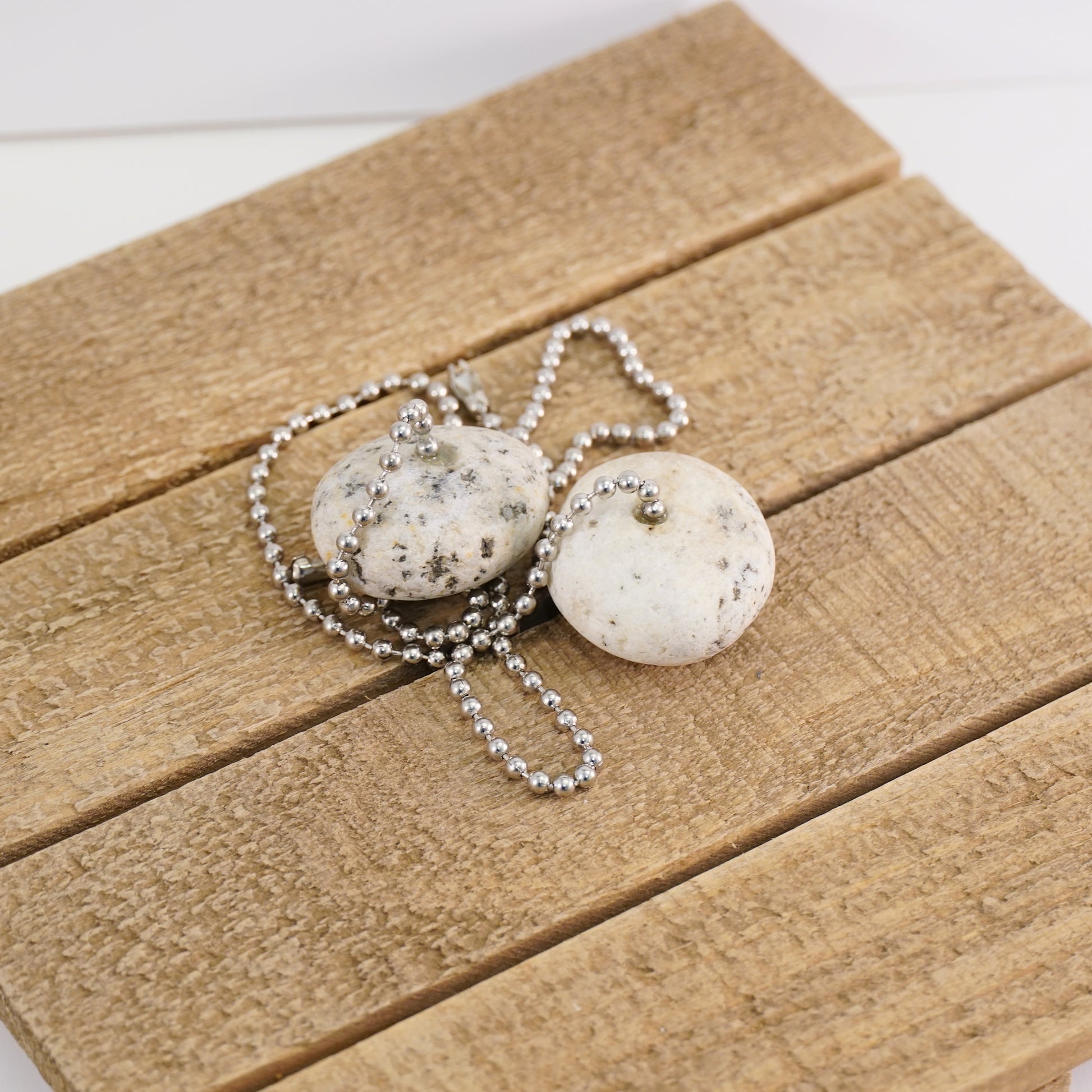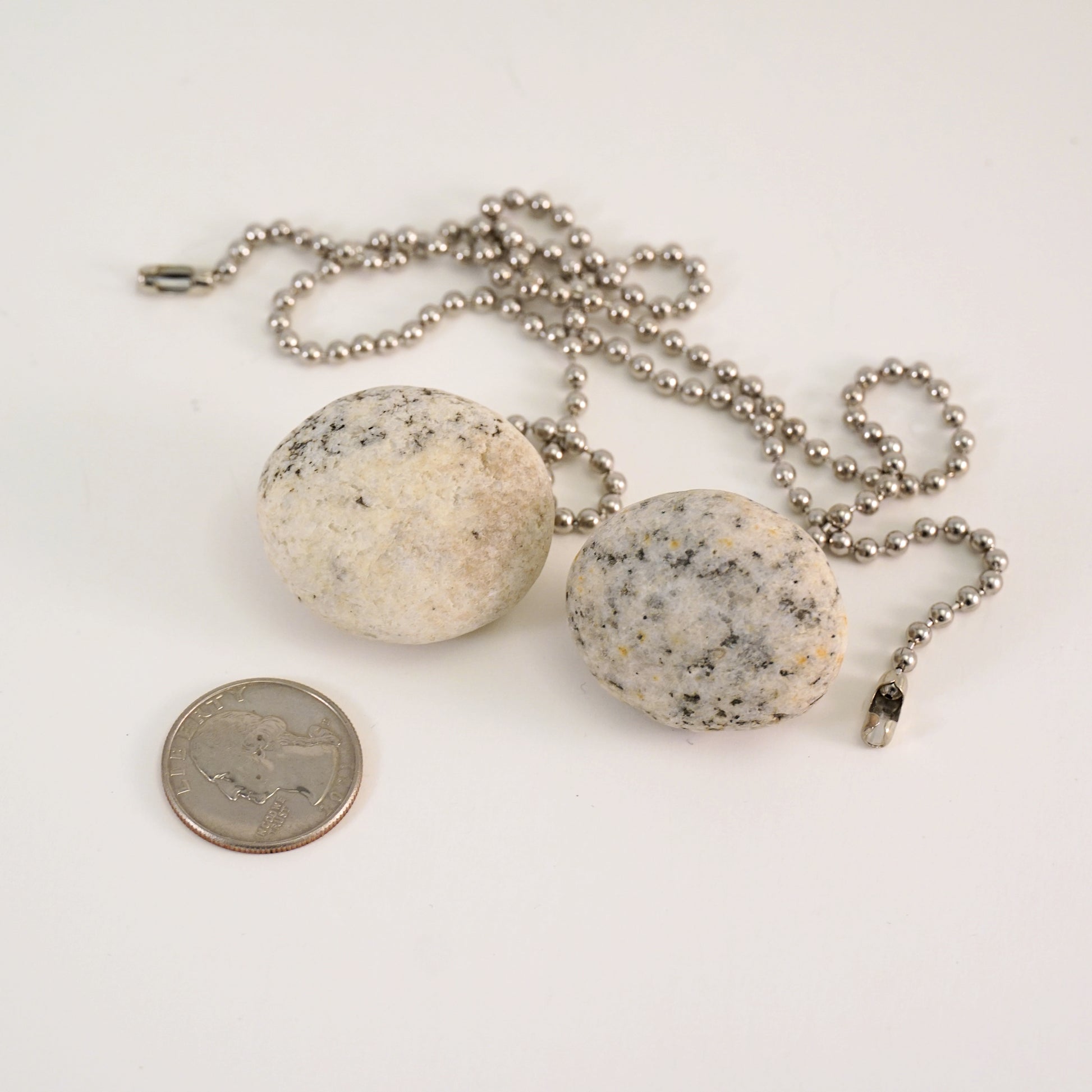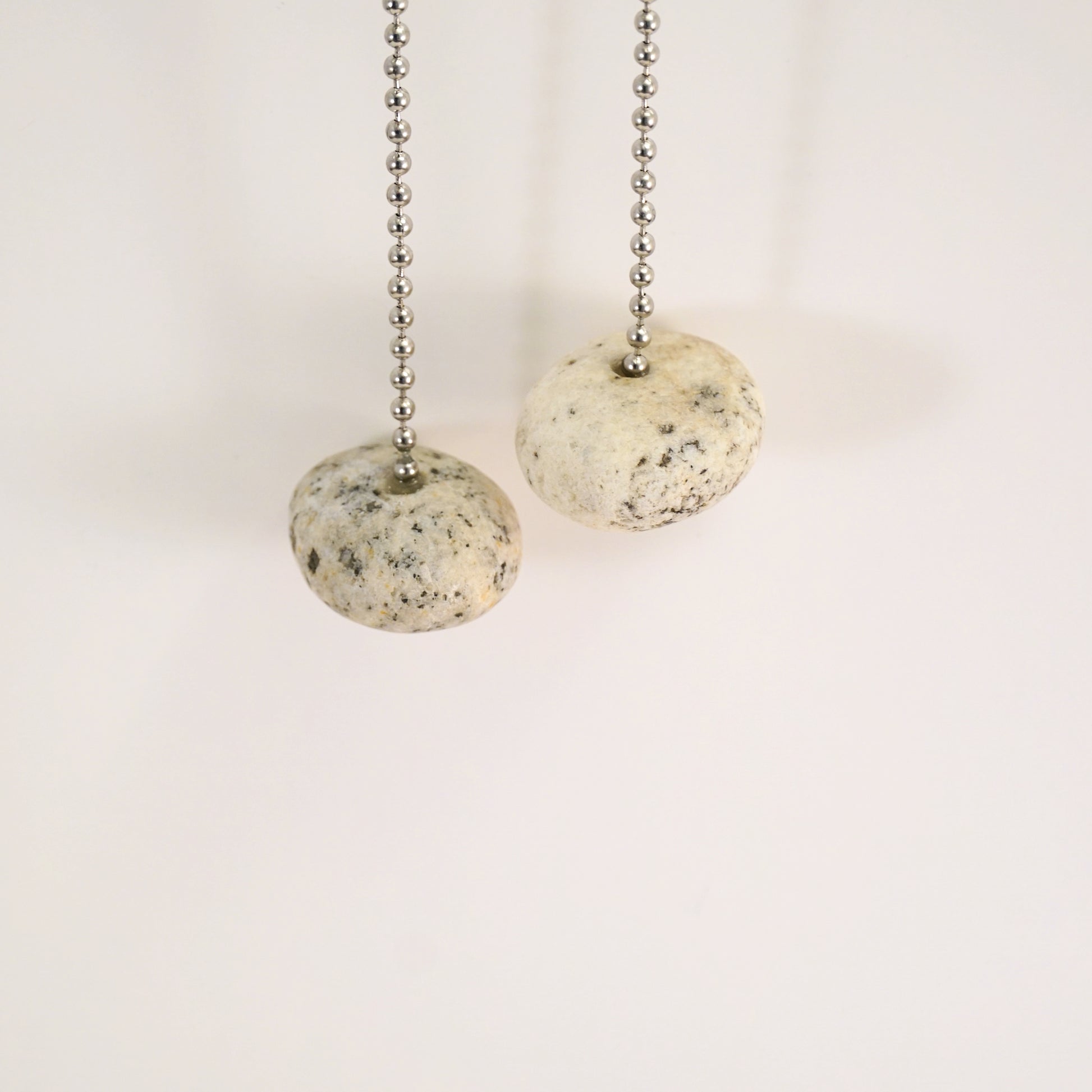 A pair of mixed granite pebbles, drilled and set with standard chrome/silver light and fan pull ball chains. The chains are 12" long and can be easily shortened.
