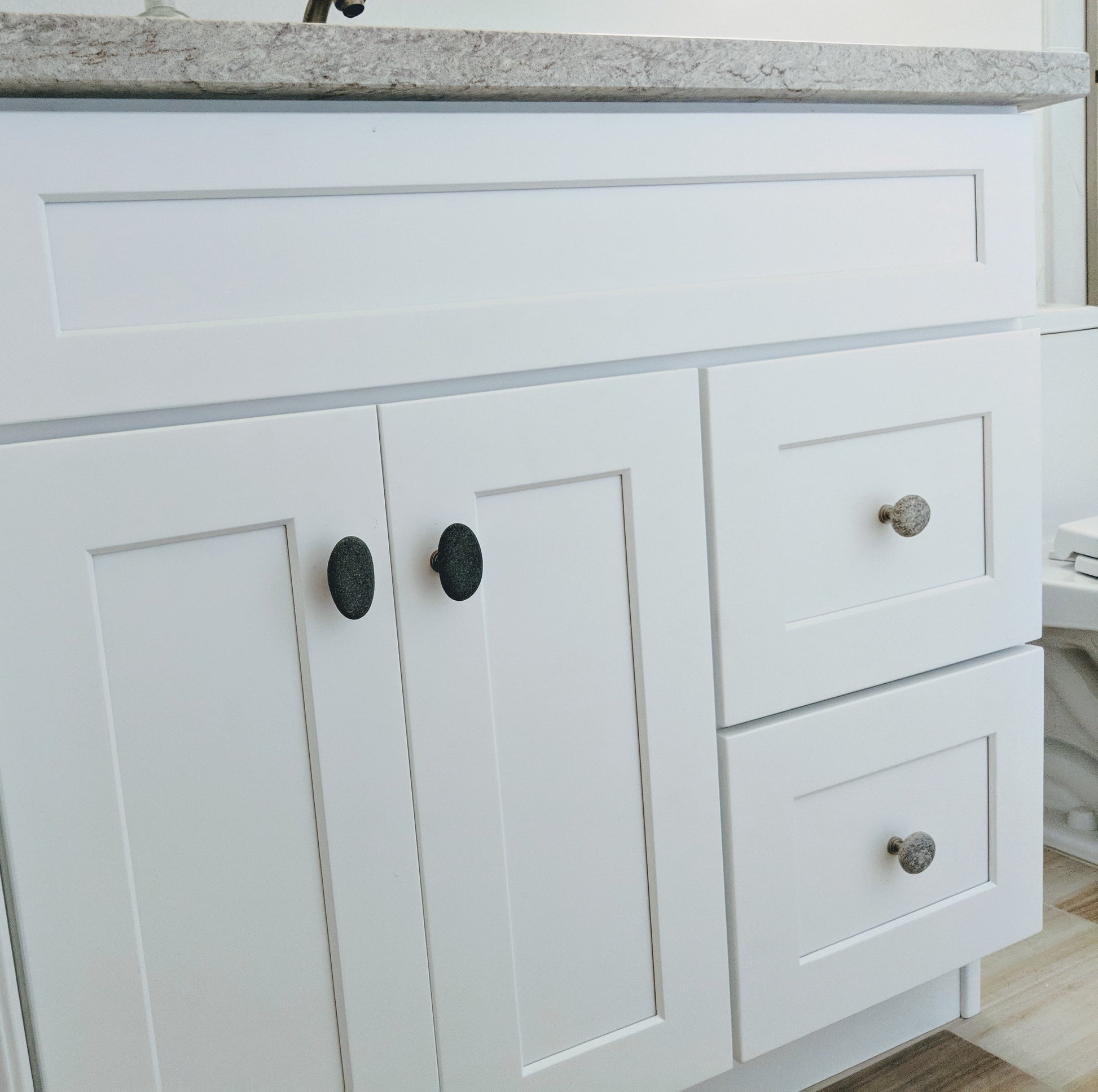 Stones average 1 1/2 - 1 3/4 inches wide and have standard 8/32 threaded cabinet knob stems. All of my cabinet knobs are handcrafted with an internal post and marine-grade epoxy for strength and durability.