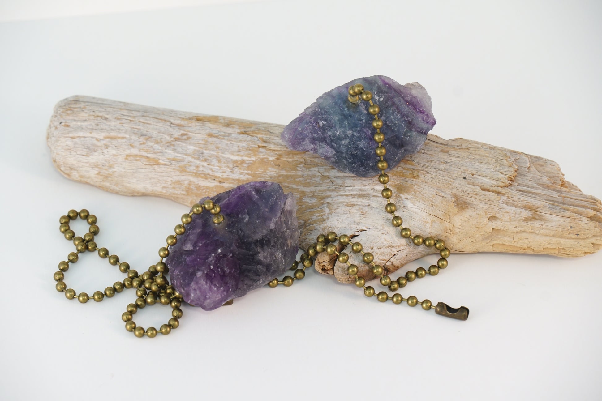 Two larger pieces of rough Rainbow Fluorite crystals set with standard Antique Brass ball chain. This is the standard chain size for most lamps and ceiling fans. Chains are 12 inches long and have a crimp style connector.