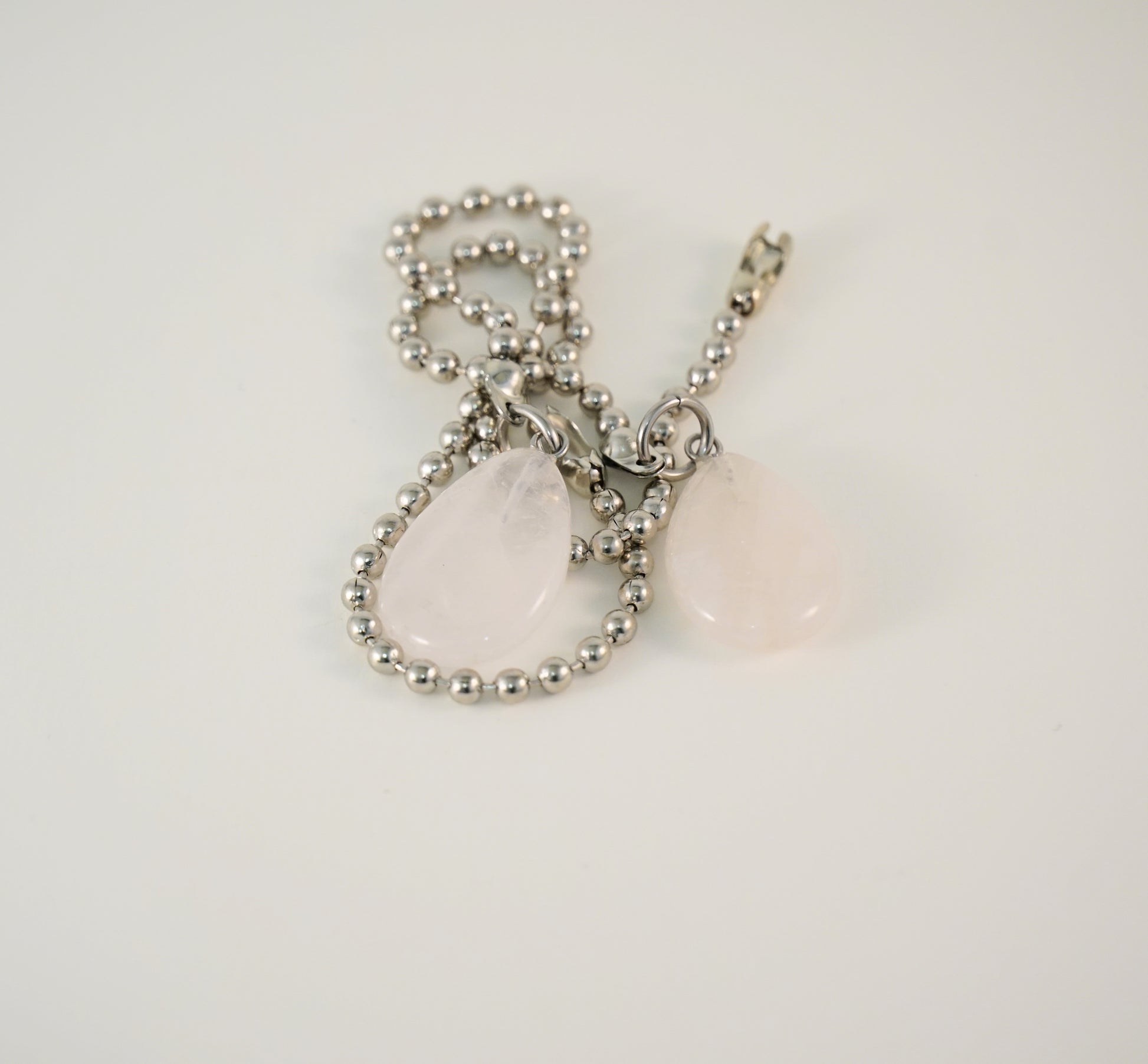 A fun pair of pale Rose Quartz drops set on 6 inch long chrome/silver standard ball chains for lamps, ceiling lights and fans.