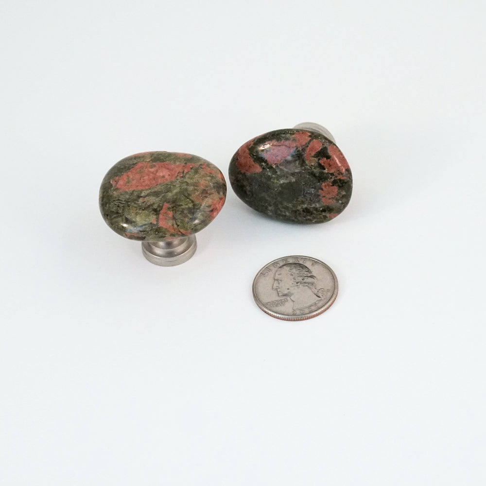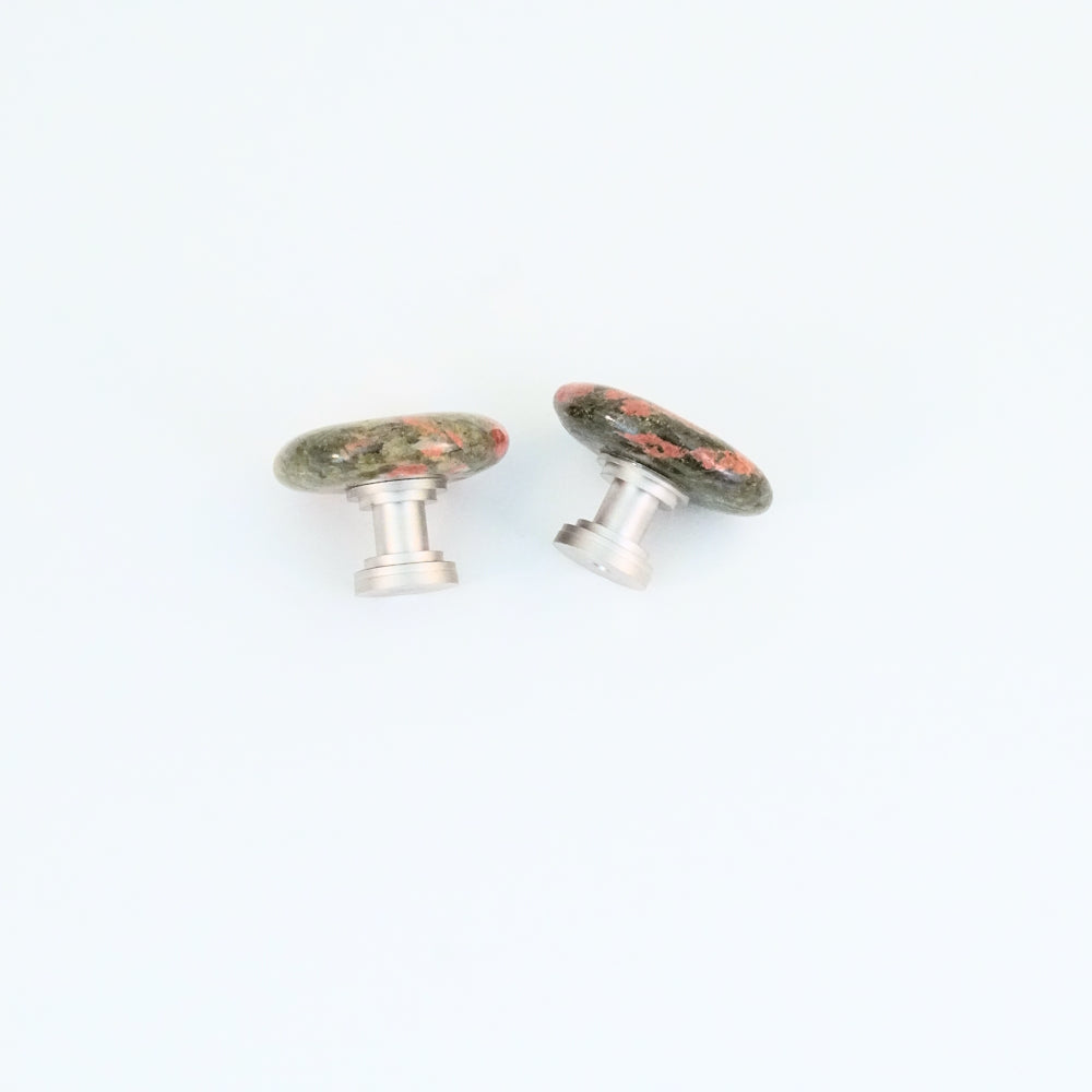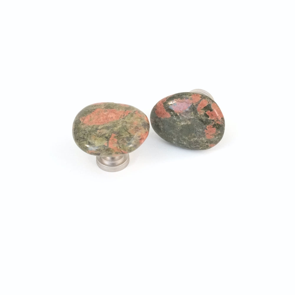 Two polished Unakite stones (a metamorphic stone comprised of pink feldspar, green epidote and quartz) set on Satin Nickel cabinet knob bases. The discs are around 1 1/2 inches across and have a terrific shine.